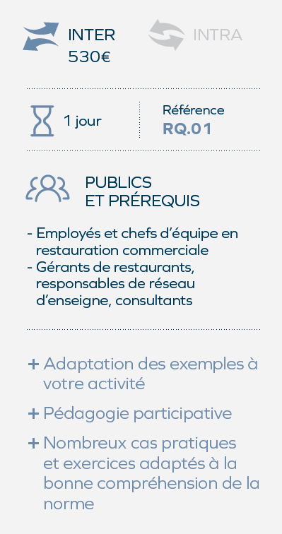 - Connaître les 12 exigences de la norme NF V 01-015 dédiée à la restauration commerciale